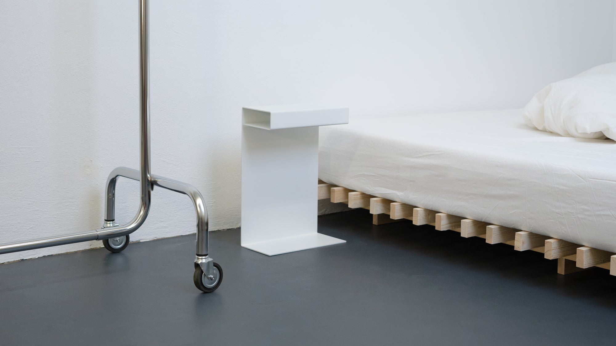 So einfach und selbsterklärend wie unsere Betten: Aus einem einzigen Stück Blech gefaltet verschiebt sich die Anmutung von filigran und unscheinbar zu einem ernstzunehmenden Möbel mit Fläche. ST8 kannst du in verschiedenen Positionen verwenden. Aufrecht stehend oder liegend für mehr Ablagefläche. Die Oberfläche ist pulverbeschichtet und damit kratz- und stoßfest. ST8 kann sogar im Freien stehen.
